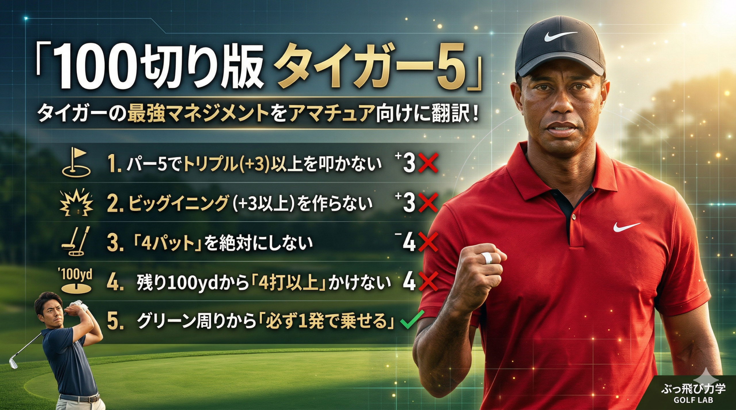 「タイガー5」とは、あのタイガー・ウッズが全盛期に、ラウンド中の無駄な失点を防ぐために設定していた5つの目標のことです。