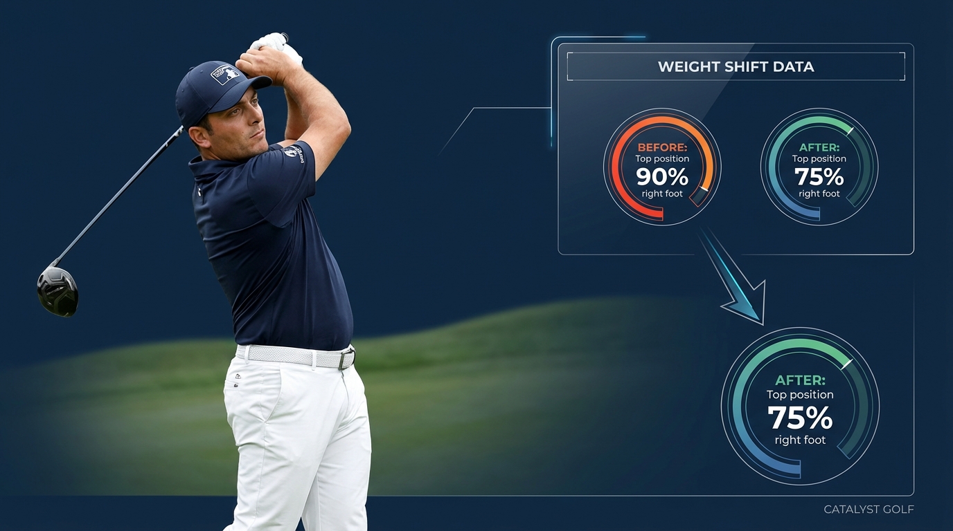 以前の彼は、トップで 90%近く も右足に荷重が残っていた。つまり、トップでまだ体重移動が完了していなかったのだ。