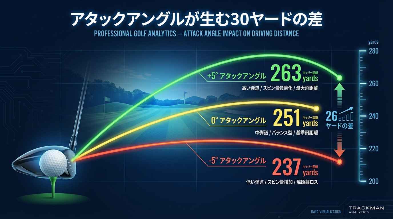 同じヘッドスピードでも、アタックアングルが違えば最大30ヤードもキャリーが変わる。これは感覚論ではなく、Trackmanが示す動かしがたい事実だ。